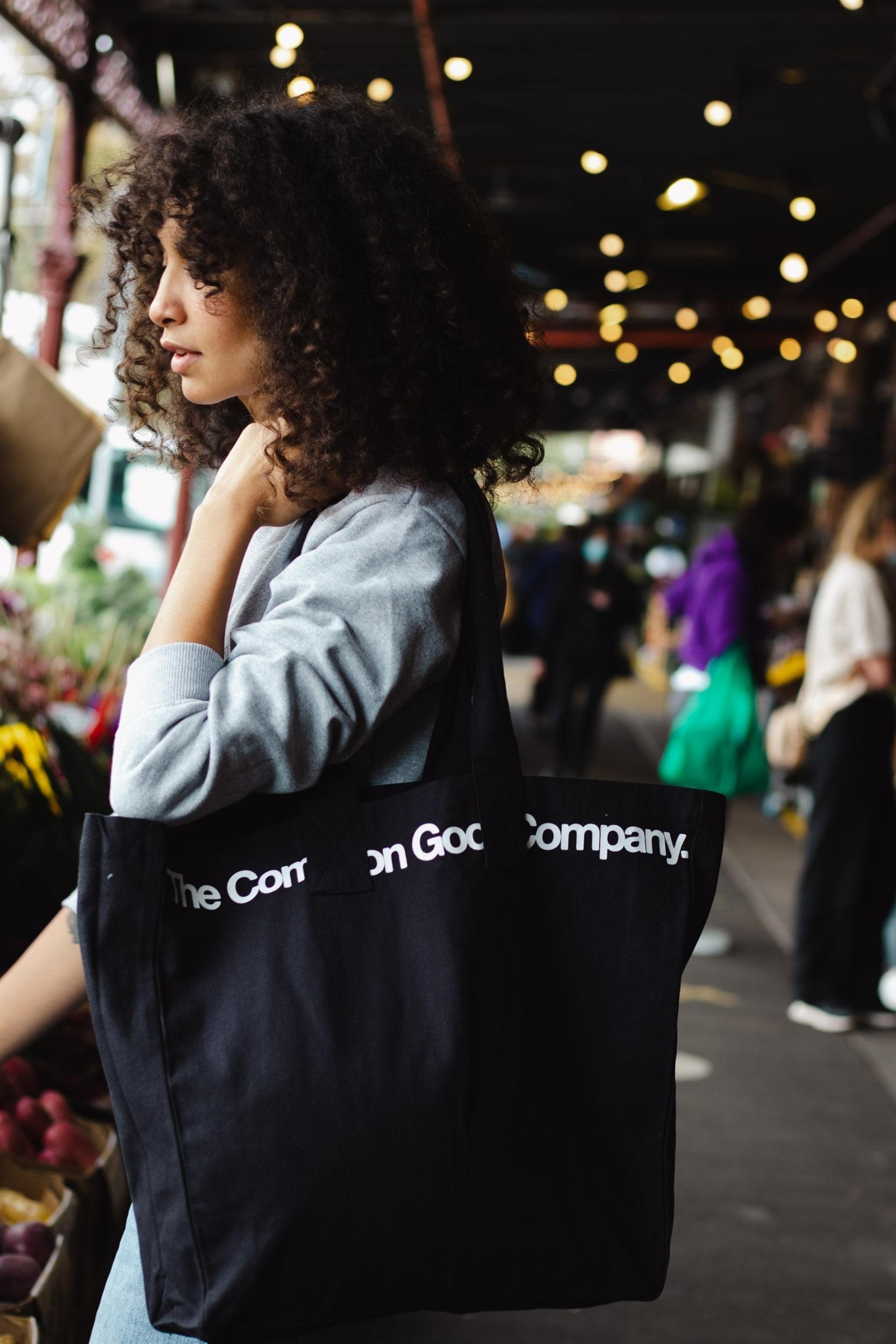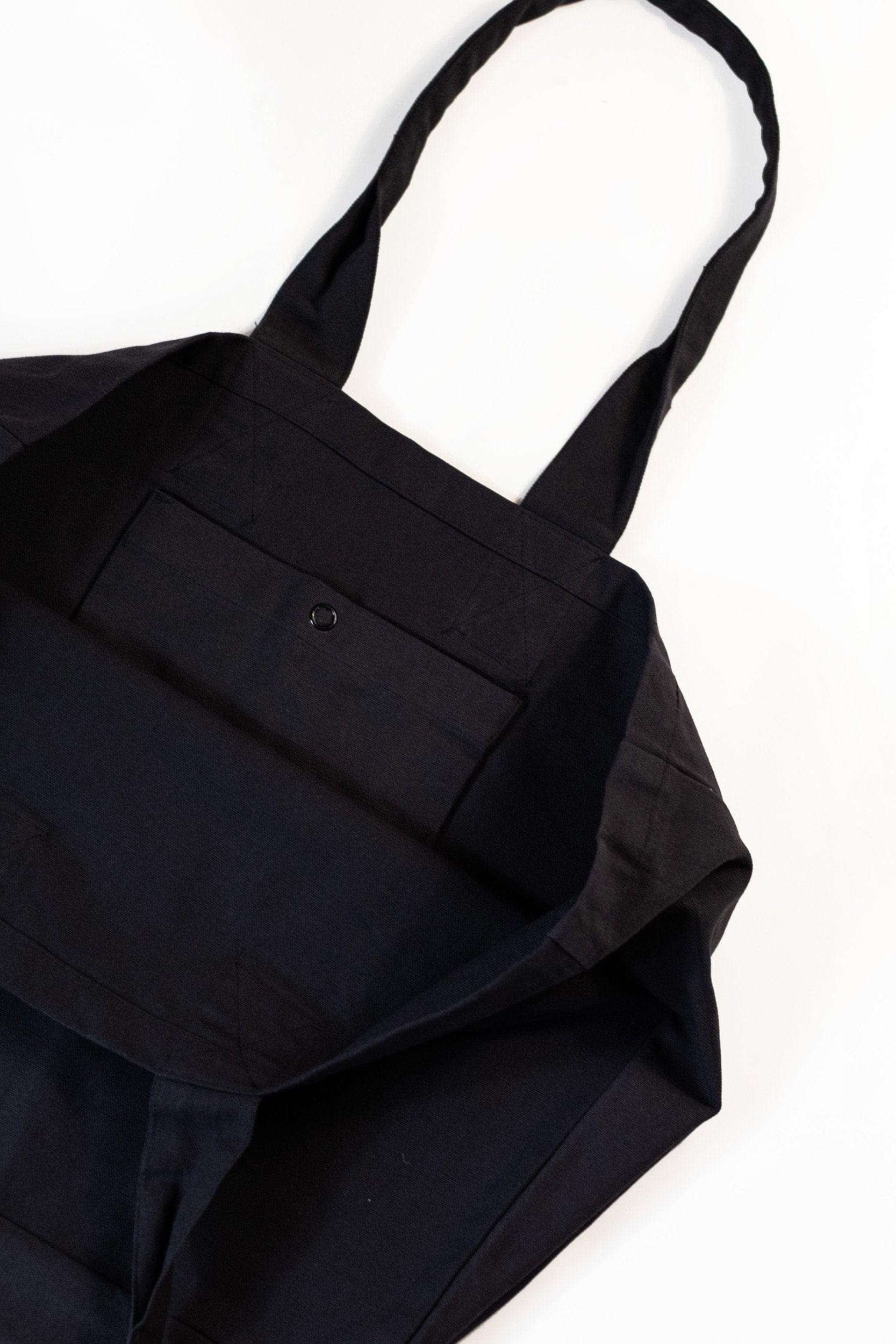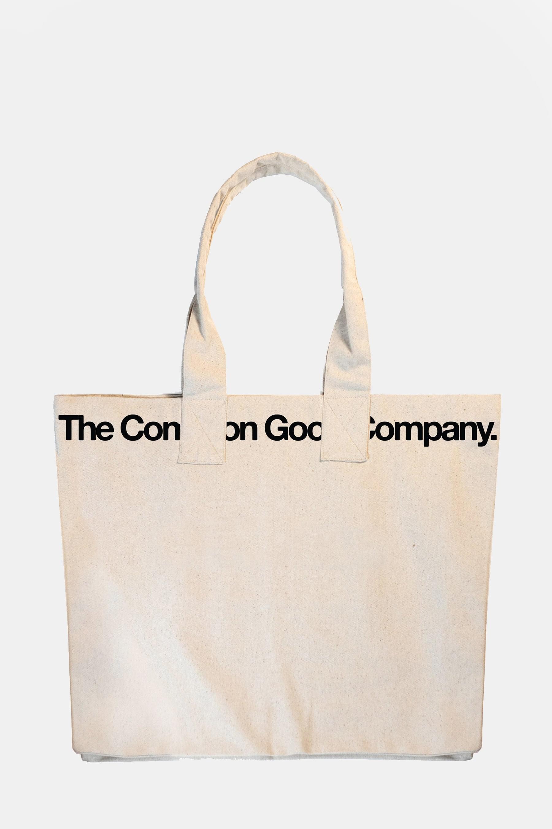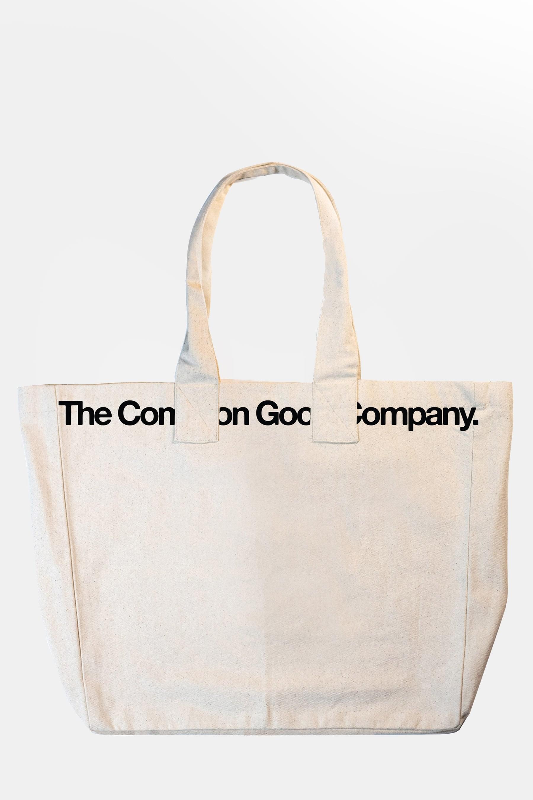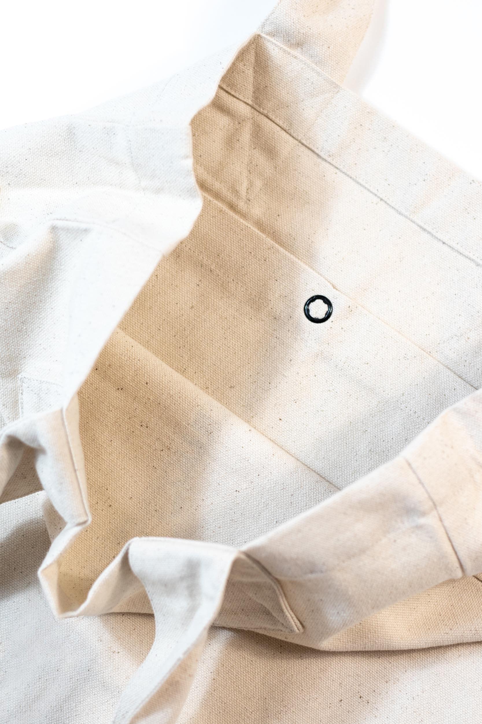 Made from 100% Recycled Cotton Canvas. Topstitched hem at top of bag, feature top handles, a printed logo to the front, side gussets for extra room and an internal snap-buttoned pocket for all your must-find-now kind of things.